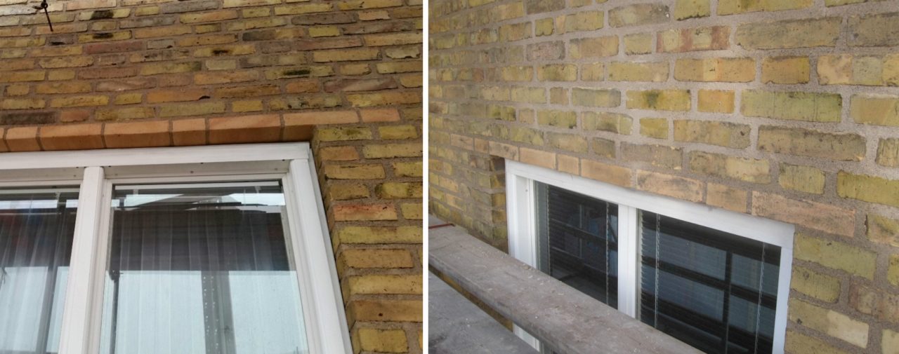 Styrelsen tog beslut om att alla rostiga armeringsjärn över fönster skulle tas bort. Vår arbetsledning mätte in alla balkar för sig i fasaden, hänsyn togs till murförband och stötfogarnas bredd. Sen började en jakt på att hitta ett bra ersättningstegel för nya tegelbalkar.