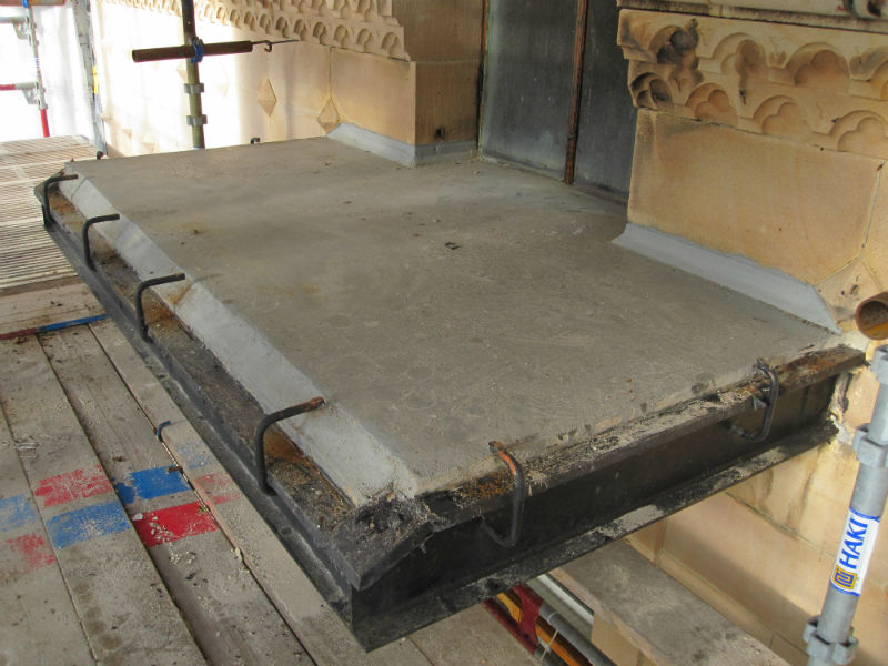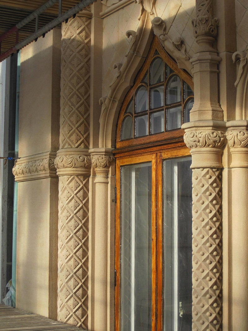 Till vänster: Balkongräckesrenovering. Det gamla räcket demonterades varsamt, blästrades och rostskyddsmålades till ISO C3. Till höger: De tunna fogarna mellan blocken i sandstensfasaden fogas om med hydrauliskt kalkbruk.