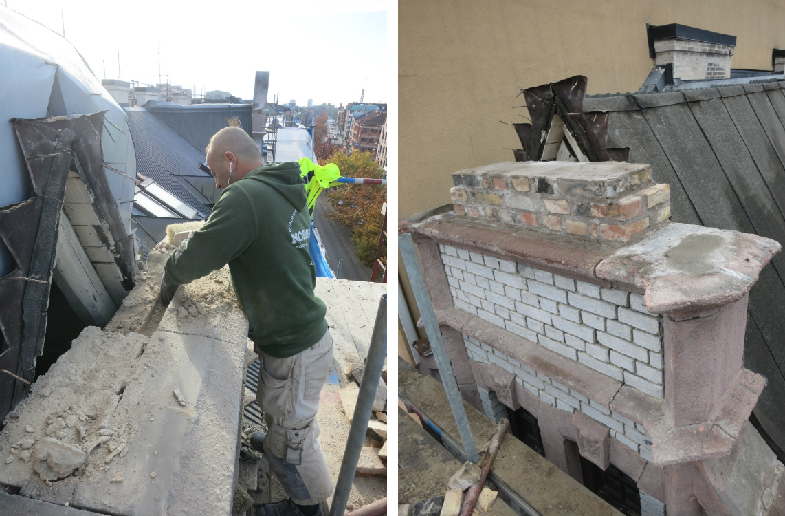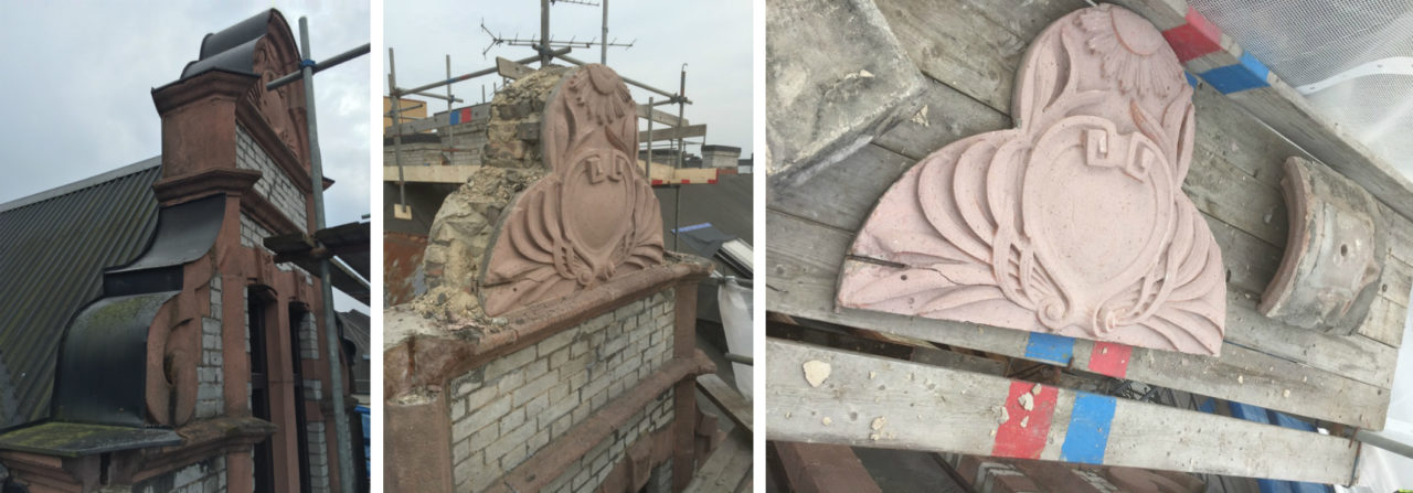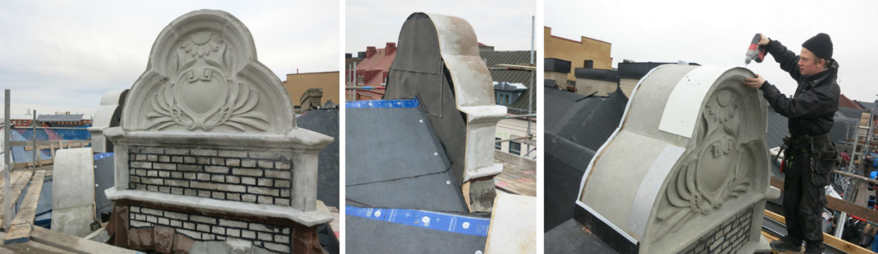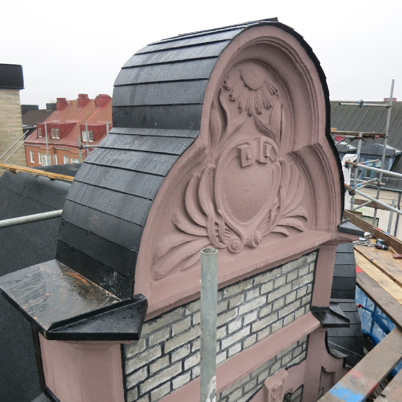 Ett häftigt och komplext arbete med demonteringen och återmonteringen av frontespiserna. Resultatet blev bra. Fogarna kompletterades med infärgat svart fogbruk lika originalet.
