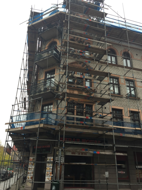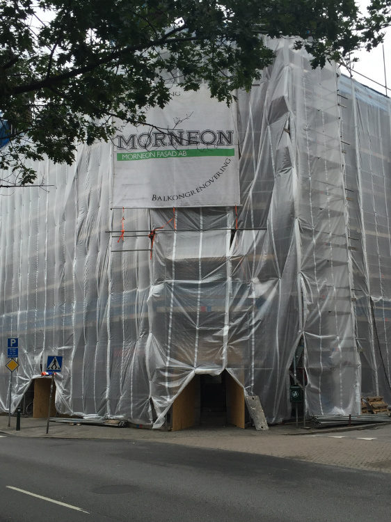 Morneon vann upphandlingen att renovera fasaderna och utföra en takomläggning. I anbudskedet var det redan rest en ställning då MKB akut behövt skrota fasaderna från lösa fasaddelar. De fasaddelar som fallit ner hade orsakats av rostande infästningar och armering inmurat och ingjutet i fasaden. Till höger är ställningen ombyggd för fasadarbeten och takomläggning.