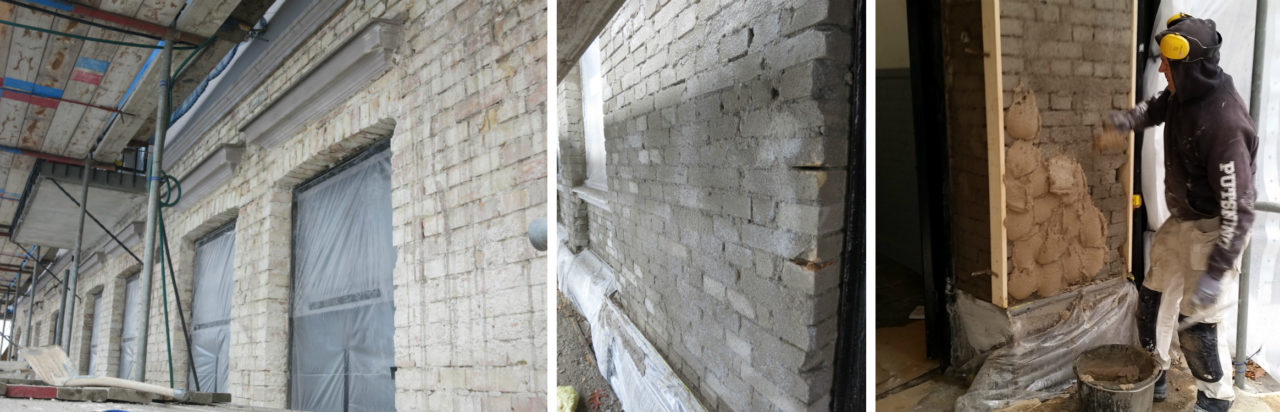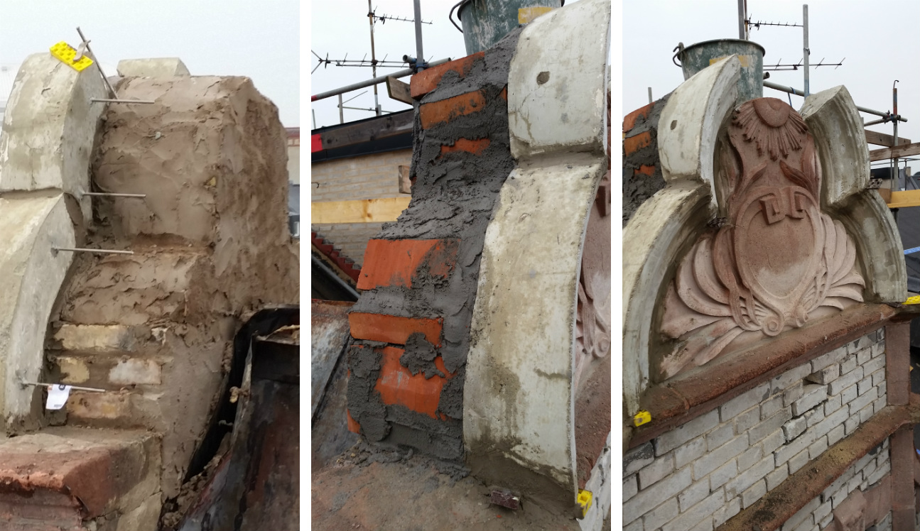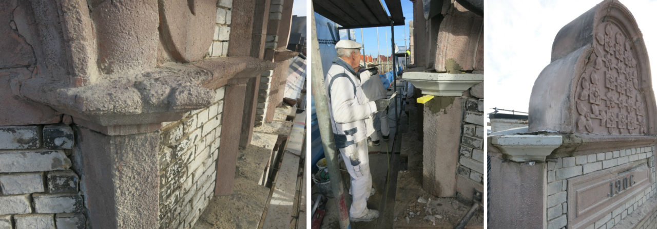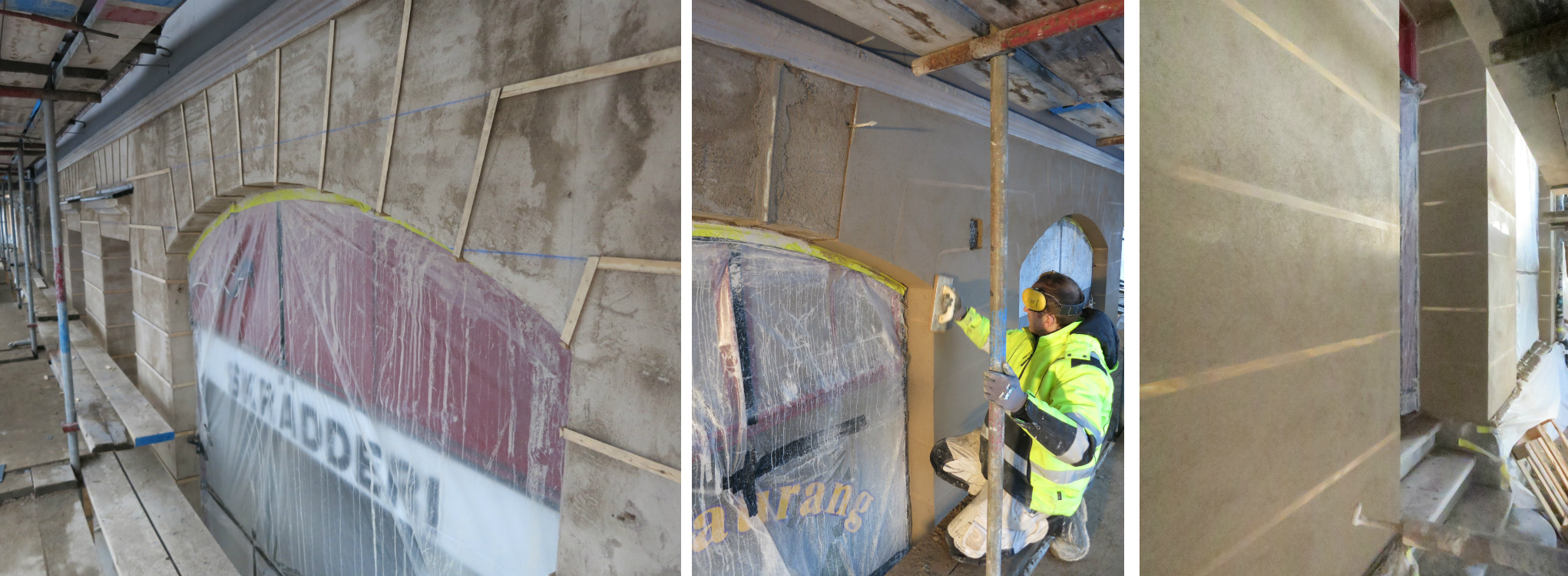 Nya stuckaturramar till frontespistavlorna dubbades med rostfria stänger och förankarades med bakmuren.
