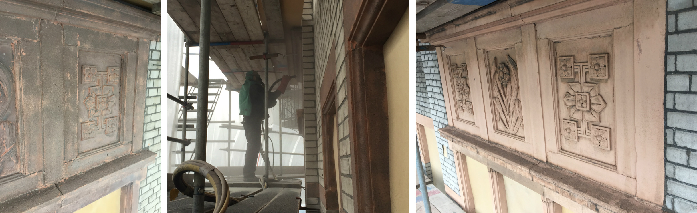 I entreprenaden skulle betongdetaljer i fasaden blästras varsamt. Resultatet blev bra.