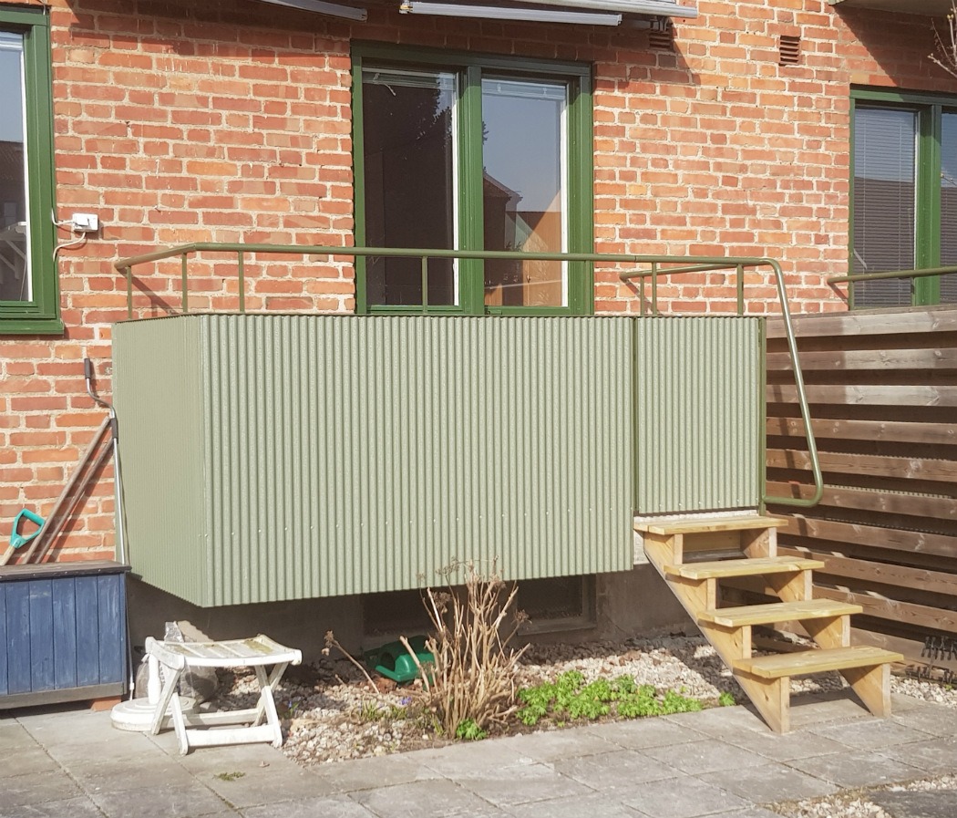 Omgjutning av balkongplattor och balkongrenovering med nya balkongräcken av smide i Kävlinge.