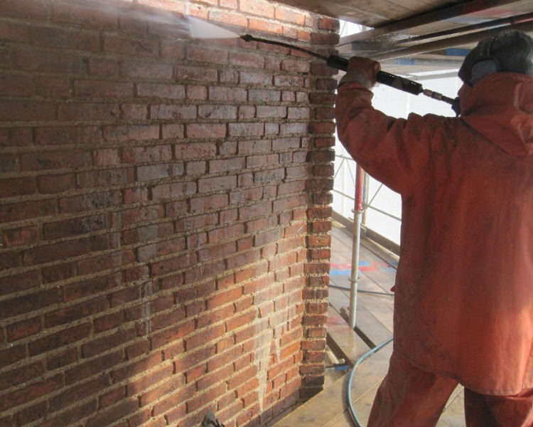 Fasaden tegeltvättades före rivning av fogarna. Fogning görs traditionellt med fogslev. För fullgod komprimering trycks bruket in med verktyget fogpinne.