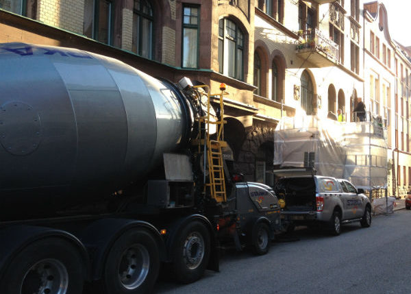 Ställning restes och stensargen demonterades, betongen revs. Efter syn tillsammans med konstruktör och beställare togs beslutet att byta rambalken.
