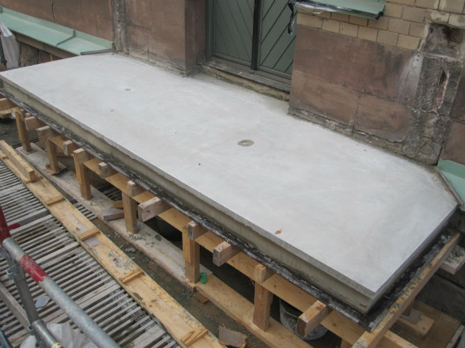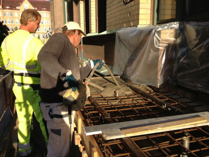 Betongen vibreras på plats. Den nya plattan avformas, plattans undersida är formad – ursprungsutseendet bibehålls.