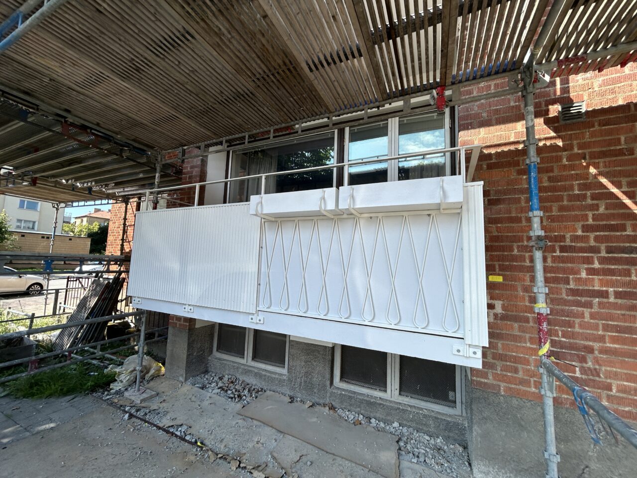 Morneon Fasad renoverar en imponerande 22 meter lång balkong på Hamngatan 4 i Malmö med traditionella metoder. Arbetet inkluderar Rabitz puts på undersidan, omgjutning av balkongplatta och räcke samt återskapande av stuckaturdetaljer i muren.