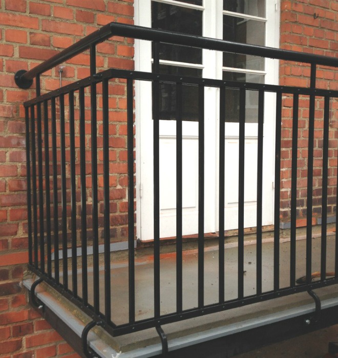 Bilden ovan visar det färdiga resultatet när de nya räckena är monterade. Räckena är en reproduktion av de gamla fast anpassade till dagens myndighetskrav enligt BBR, med förändringen att räckesinfästningarna görs på framsida balk.