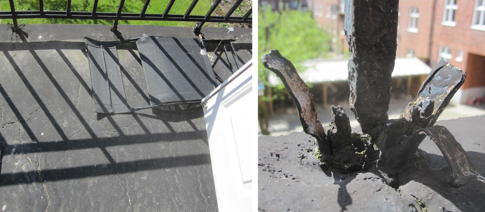Räckenas fötter var sönderrostade samt att tätskiktet var uttjänt.