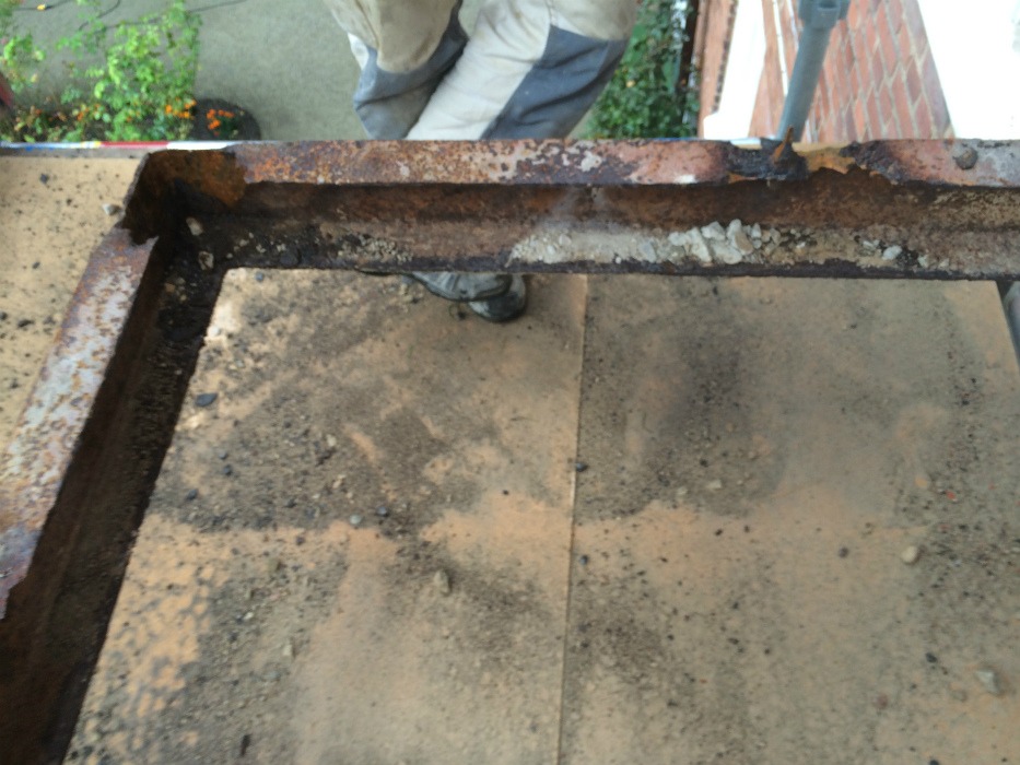 Morneon fick förtroendet att utföra balkongrenoveringen till föreningen. Här på bilden ser vi rambalken efter betongen är riven. Pga. räckesståndarnas infästning, uppifrån och ner, så har relativt stora mängder vatten trängt ner och skapat en korrosiv miljö. Rambalkarna behövde bytas.