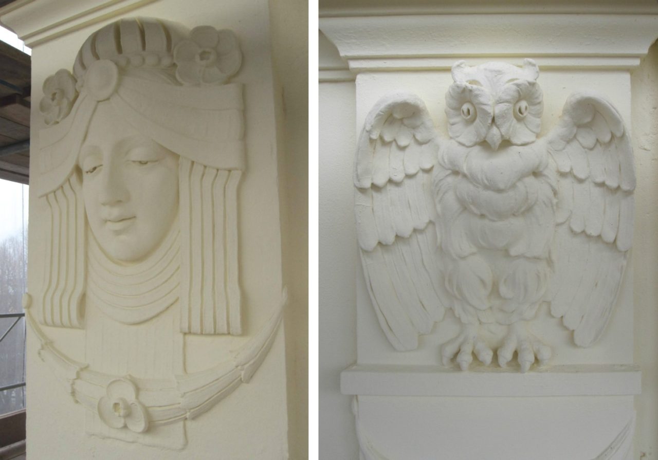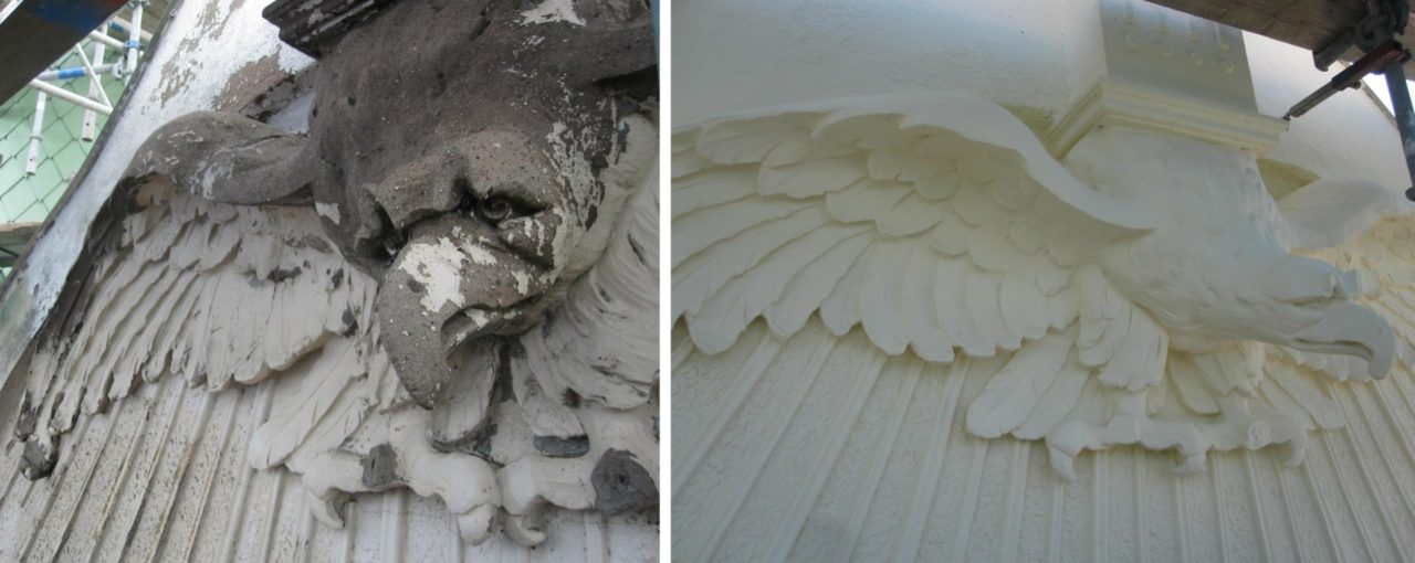 Kungsgatan 32:s magnifika örnar före och efter lagning och avfärgning.