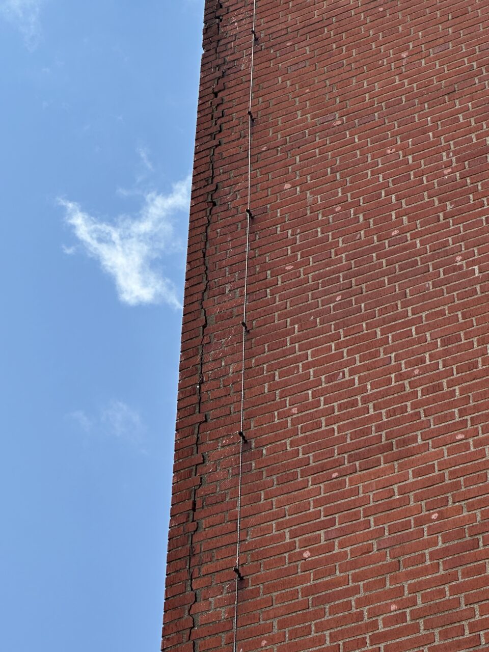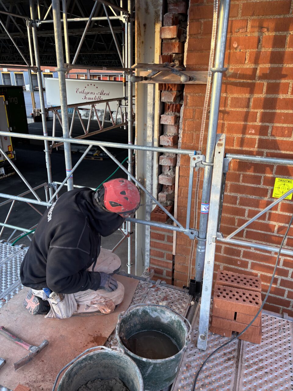 Den delen av fasadmuren som nu renoveras hade drabbats av omfattande sprickbildning, troligen orsakad av rörelser från den intilliggande gaveln. Sådana skador kräver en total ommurning för att återställa murens stabilitet och skydda fastigheten mot framtida problem.