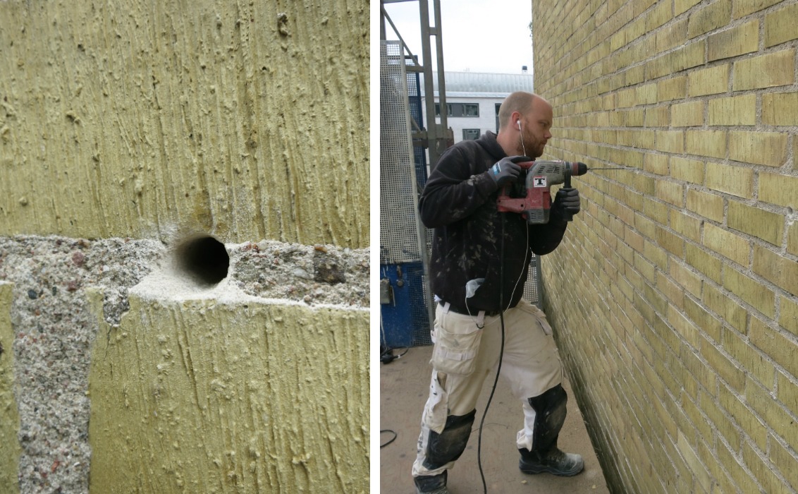 Vi kompletterar befintliga tegelförankringar mellan bakomvarande stomme i betong till fasadteglet med rostfria kramlor 4 st/ m².