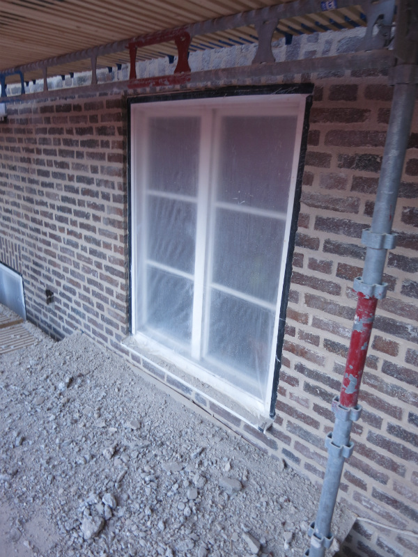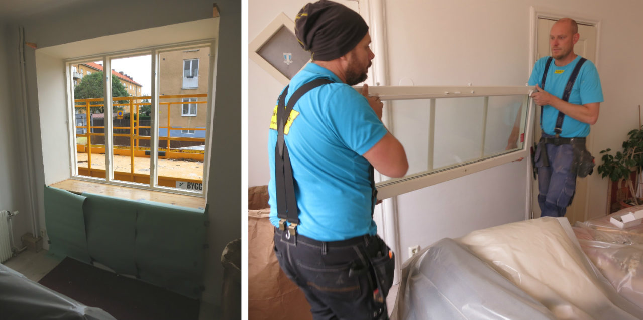 Som ett alternativ till smygplåtar kan man göra en traditionell bruksfog, en av fördelarna är att fönstren ser mer smäckra och eleganta ut. Till höger ser ni hur de nya fönstren täcks in och skyddas innan fasaderna fogas om.