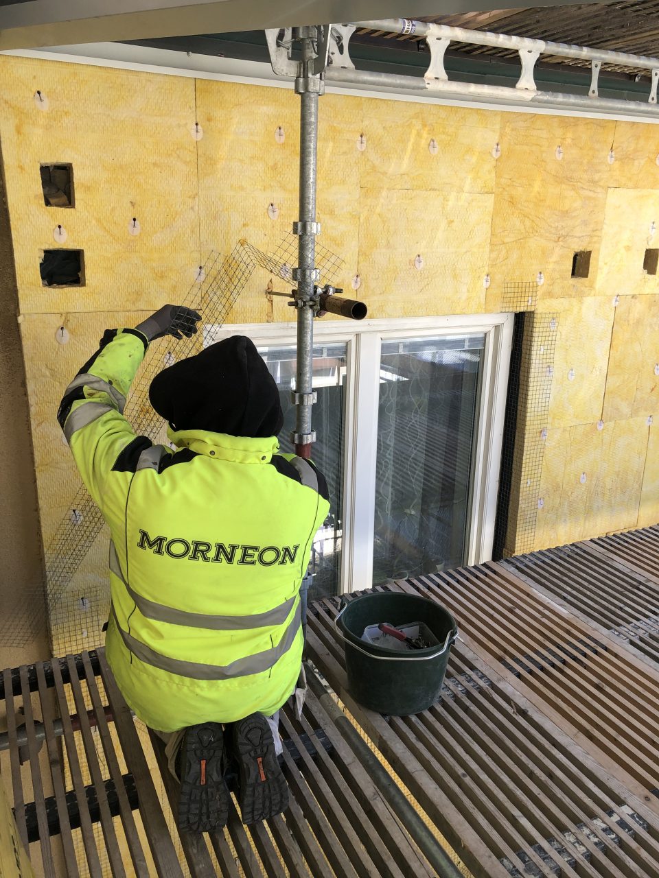 Fasadrenovering med tilläggsisolering och nya balkonger.