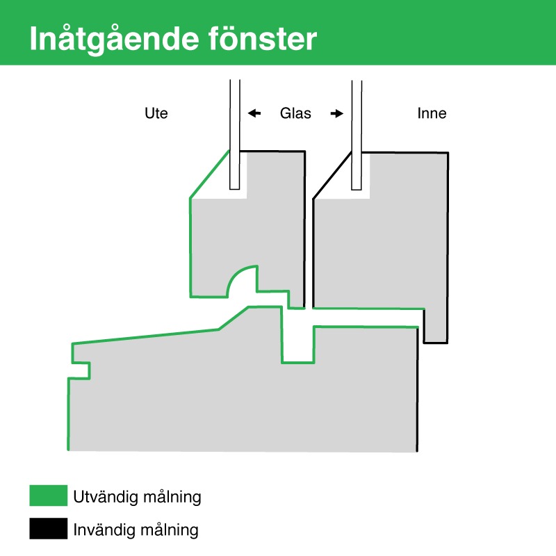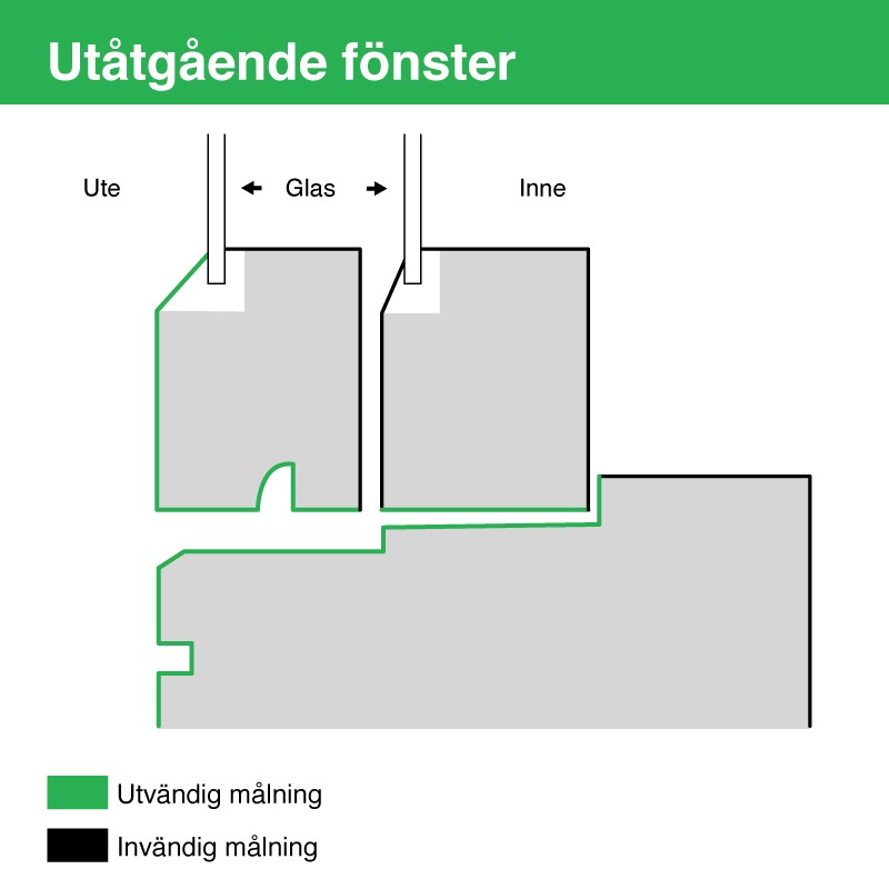- Vid inåtgående portar, dörrar och fönster ska följande räknas till utomhusmålning: Över-, under- och bakkant på portblad, dörrblad och fönsterbågar. Framkant räknas till inomhusmålning. Vid inåtgående fönster, se även bilden ovan för en överblick av vilka delar som räknas som utvändig respektive invändig målning.